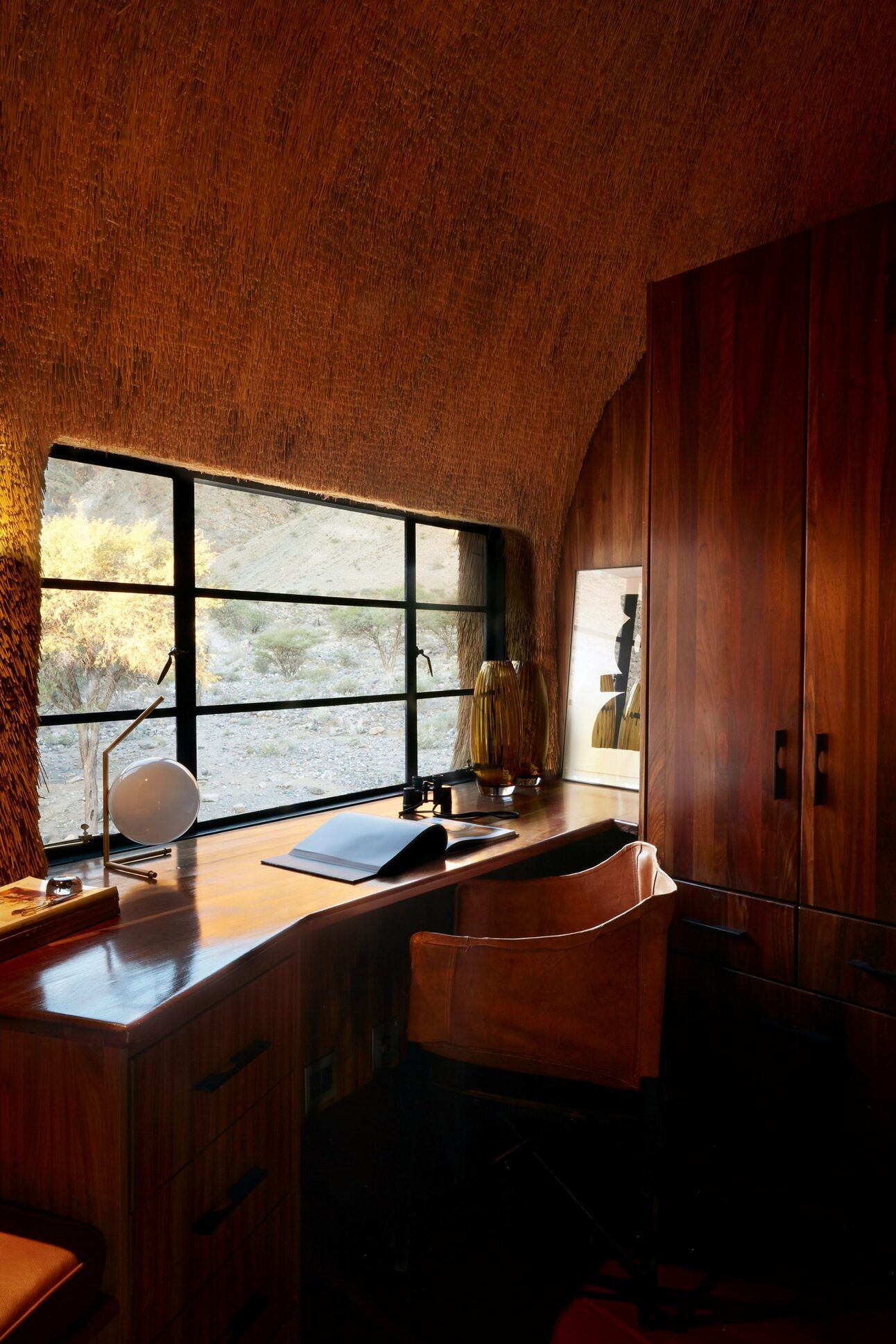 Tucked into a straw-clad corner, this midcentury-leaning workspace feels both earthy and refined. Natural texture softens the geometry, proving that even an office can feel like a nest.