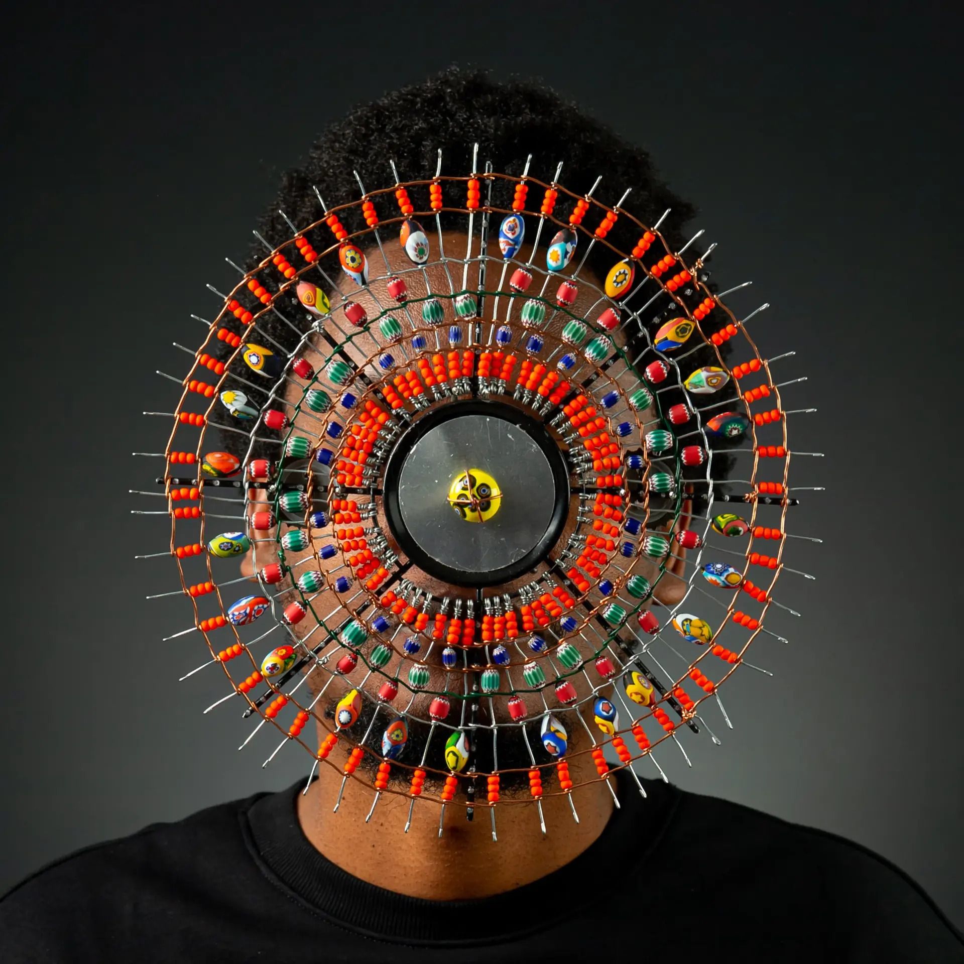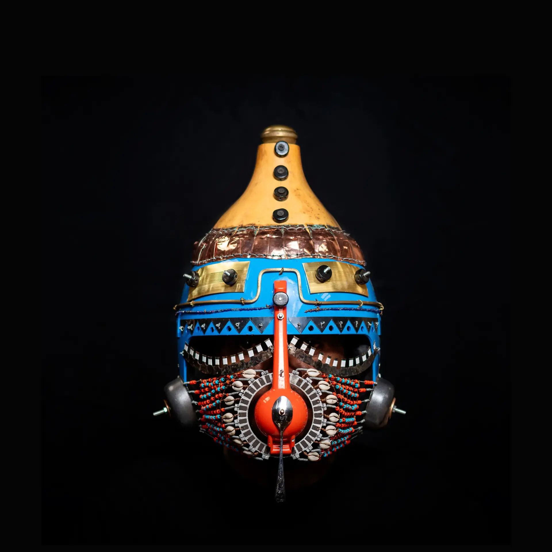 Kabiru’s pieces are not just wearable sculptures—they’re systems. Assemblies of discarded wires, bolts, forks, and beads that speak the language of both invention and ancestry. His work pushes the boundaries of what comfort looks like in a hyper-digitized, throwaway over-consumerist world.