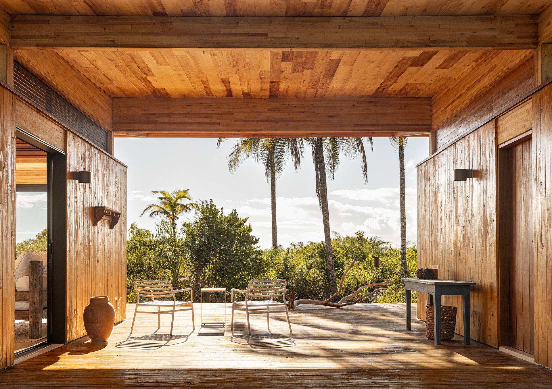That honey-gold timber tone runs consistently through the house, across walls, ceilings, decks, and built-ins, creating a visual continuity that feels warm, grounded, and deliberate. It softens the architecture and catches light beautifully, shifting from pale gold in the morning to deeper amber tones by sunset.
